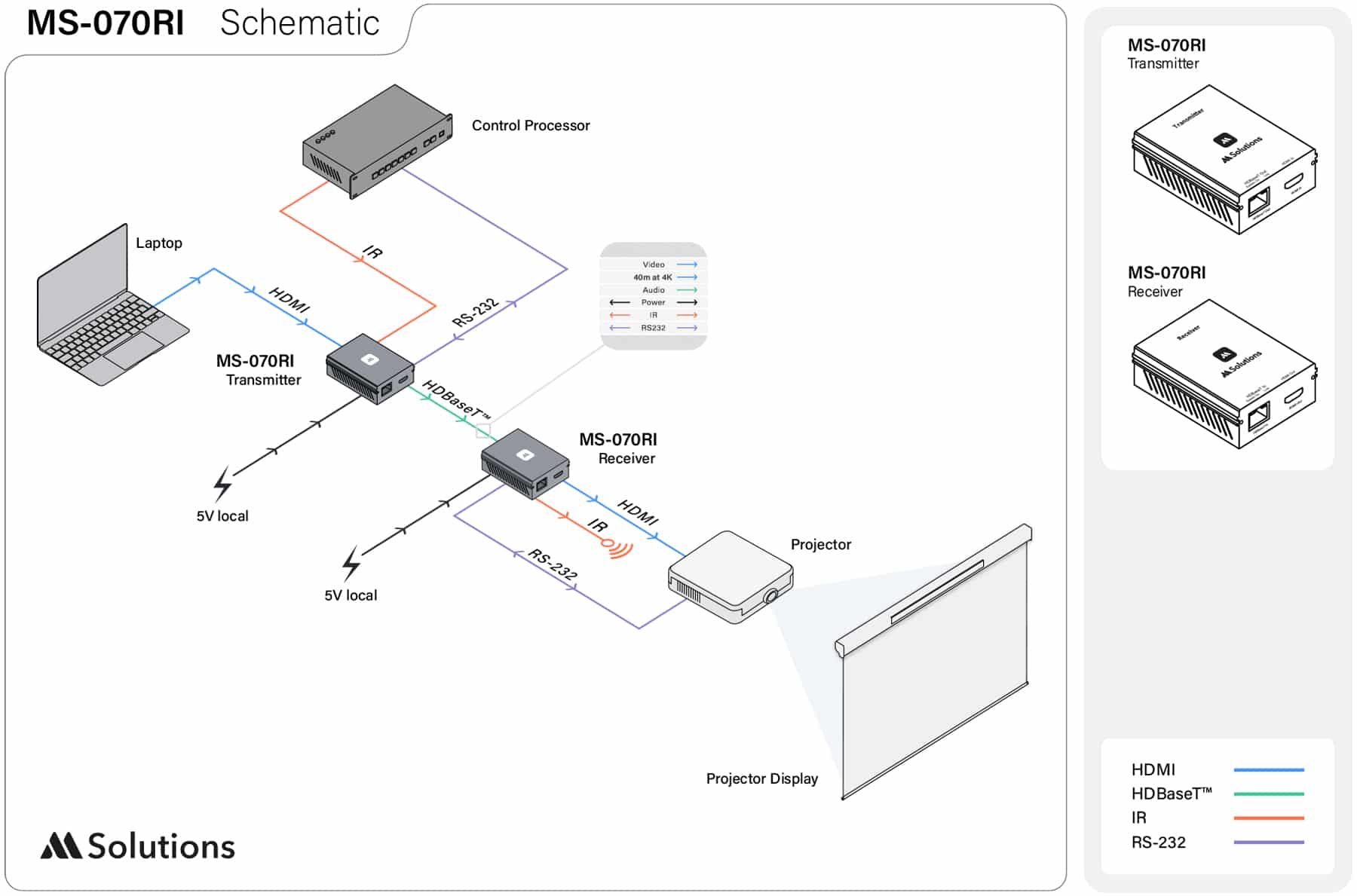 The MSolutions MS-070RI is a 4K HDMI extender using uncompressed HDBaseT technology to extend 4K UHD & HDR video (10.2Gbps) to a distance of up to 40m over single CAT cable with 1080p or lower resolutions to up to 70m. The extender provides bi-directional RS-232 and a single channel IR link between TX to RX, or RX to TX.