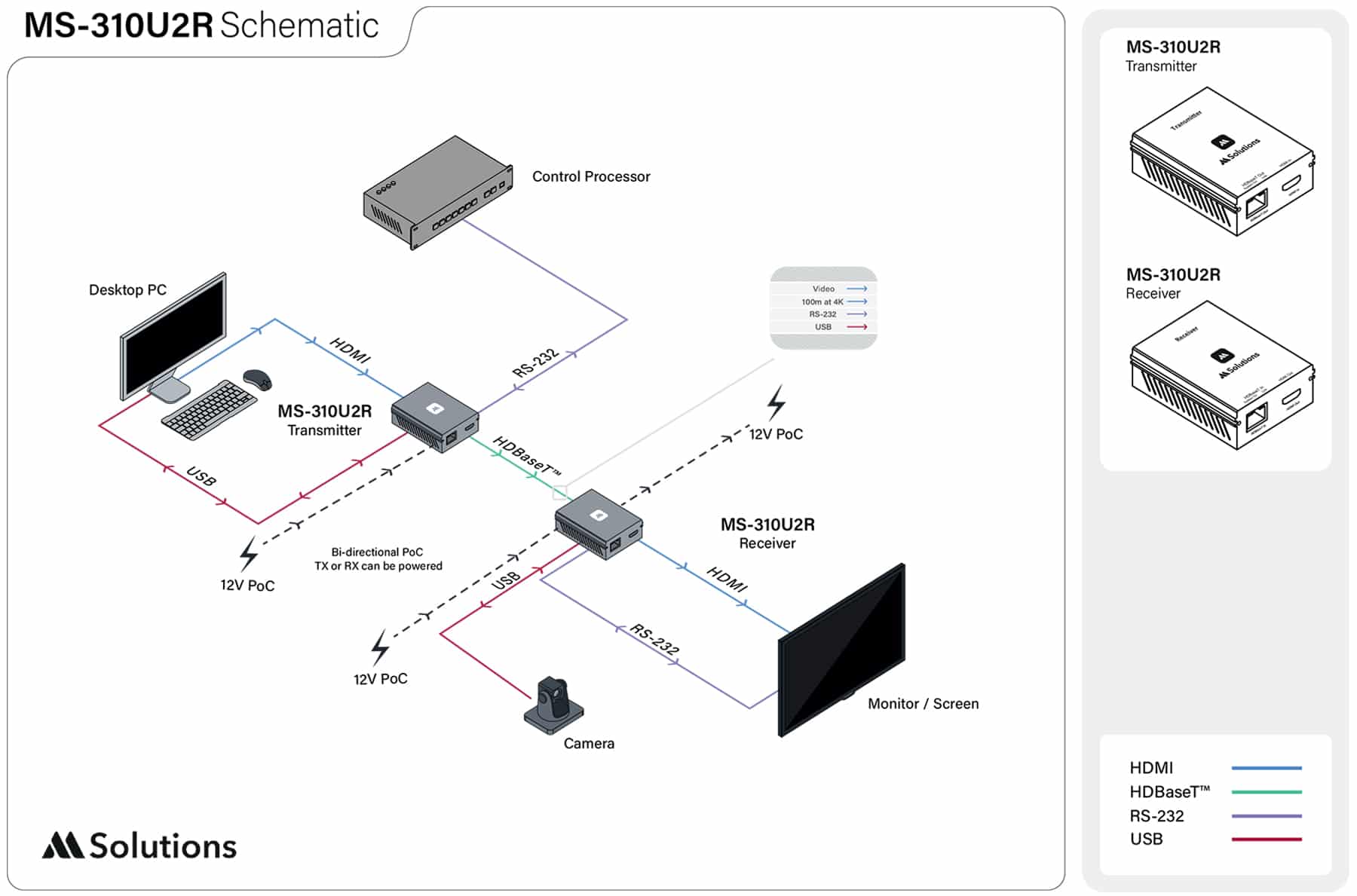 The MSolutions MS-310U2R is a 4K HDMI / KVM HDBaseT extender set allowing for uncompressed video and audio to be extended up to 100m at 4K UHD (10.2Gbps), and 100m at 1080p or lower resolutions. A 2 port USB2.0 channel allows for bi-directional USB client to host connectivity for a variety of applications. The unit also features RS-232 serial pass-through.